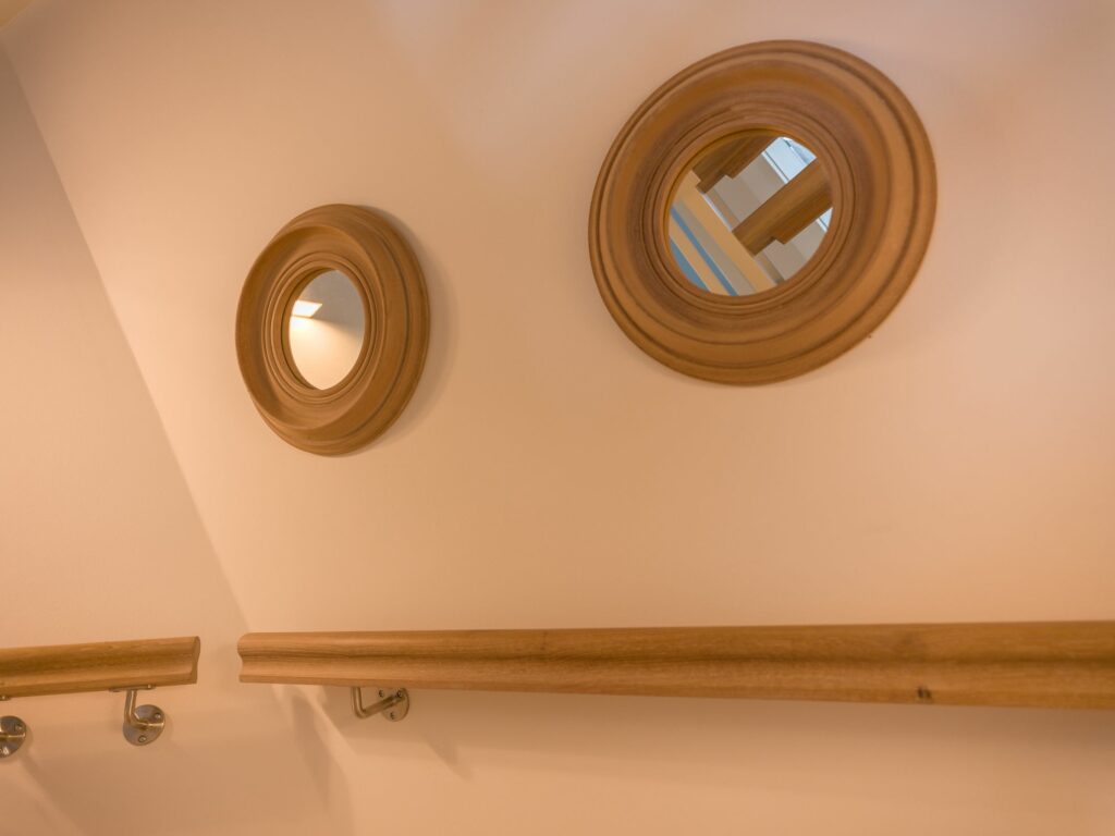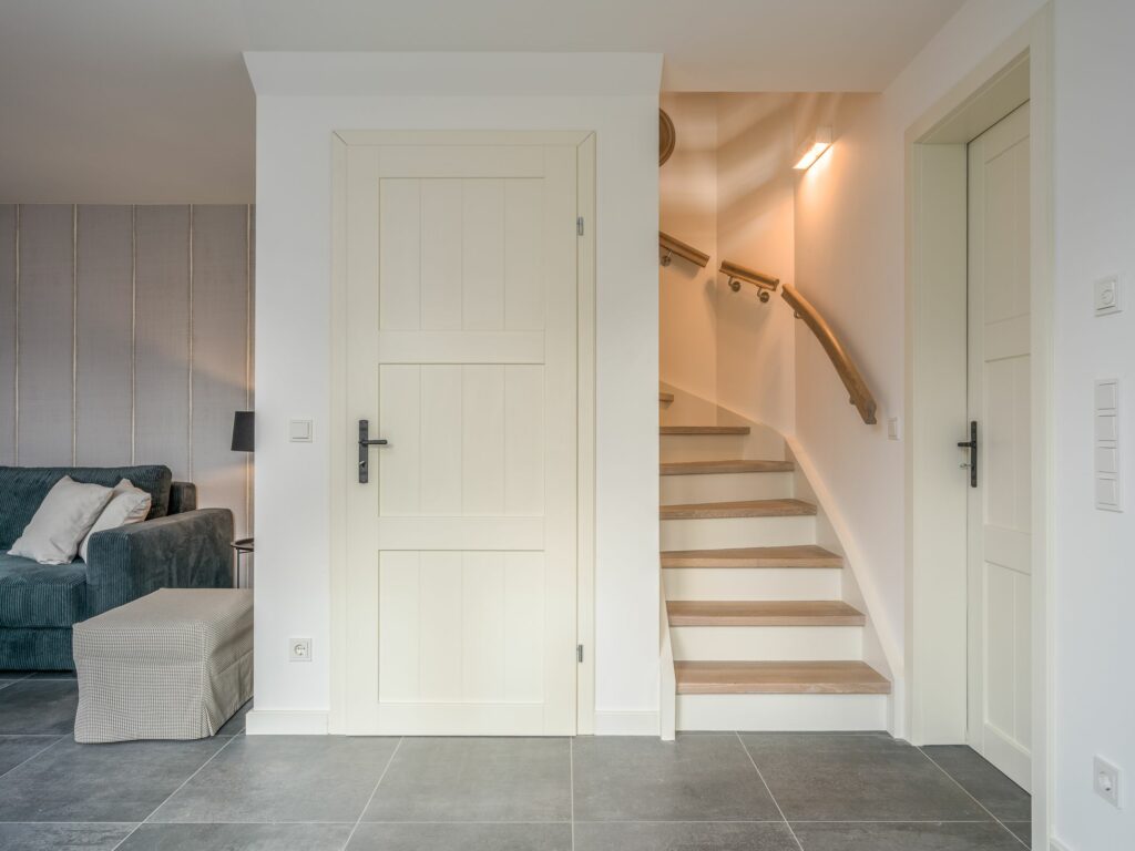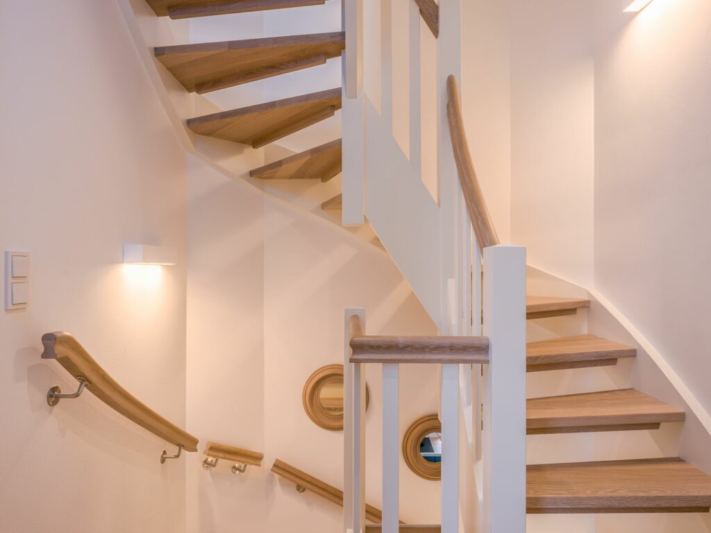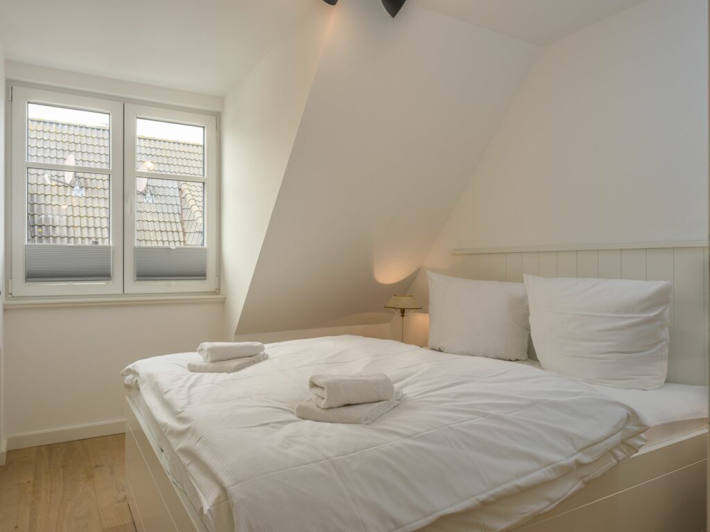 Eine Treppe höher liegen die beiden Schlafzimmer. mit jeweils einem Doppelbett. Begleitet werden sie von einem großen Bad mit Naturstein und hochwertiger Ausstattung wie z.B. einer Walk-in Dusche. Die Einrichtung im ersten OG ist nicht nur schön, sondern auch hochwertig: vom Holzboden, über Naturstein bis hin zu maßgefertigten Tischlereinbauten. Ein zeitlos-nordischer Look, der Qualität und Behaglichkeit vereint.
