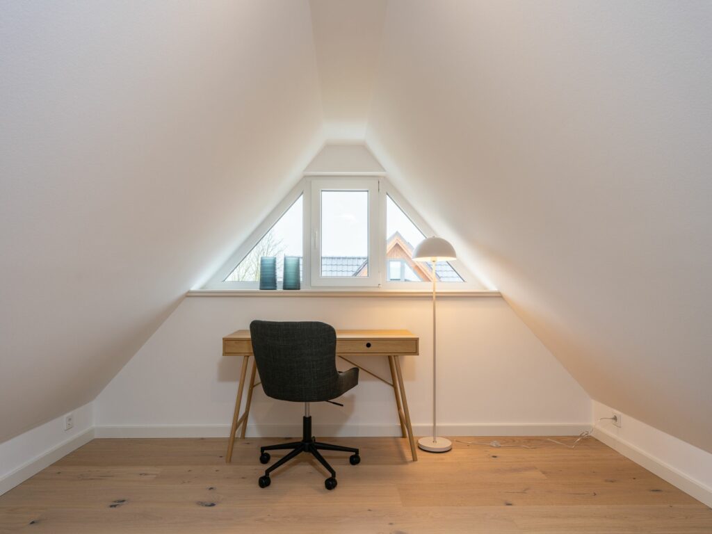 Wer auch im Urlaub ab und an mal arbeiten muss findet im Dachgeschoss neben Schreibtisch und schönem Ausblick auch die nötige Ruhe dazu.