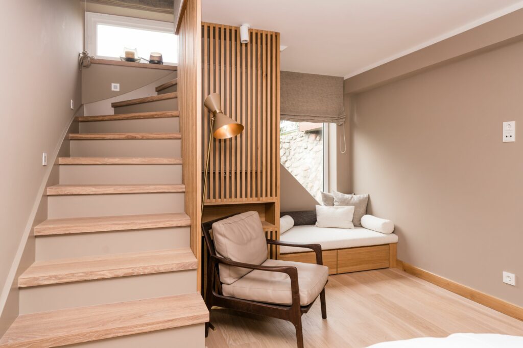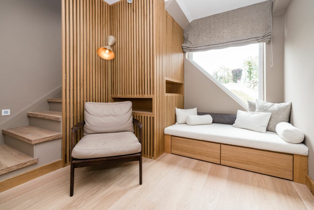 Eine Treppe tiefer befindet sich das Schlafzimmer. Hier lädt das bequeme Boxspringbett zum Träumen ein und für kleine Auszeiten am Tag, die kleine Lounge-Ecke direkt am Fenster. Green living at it's best!