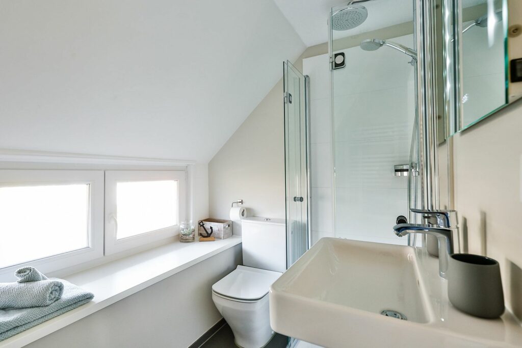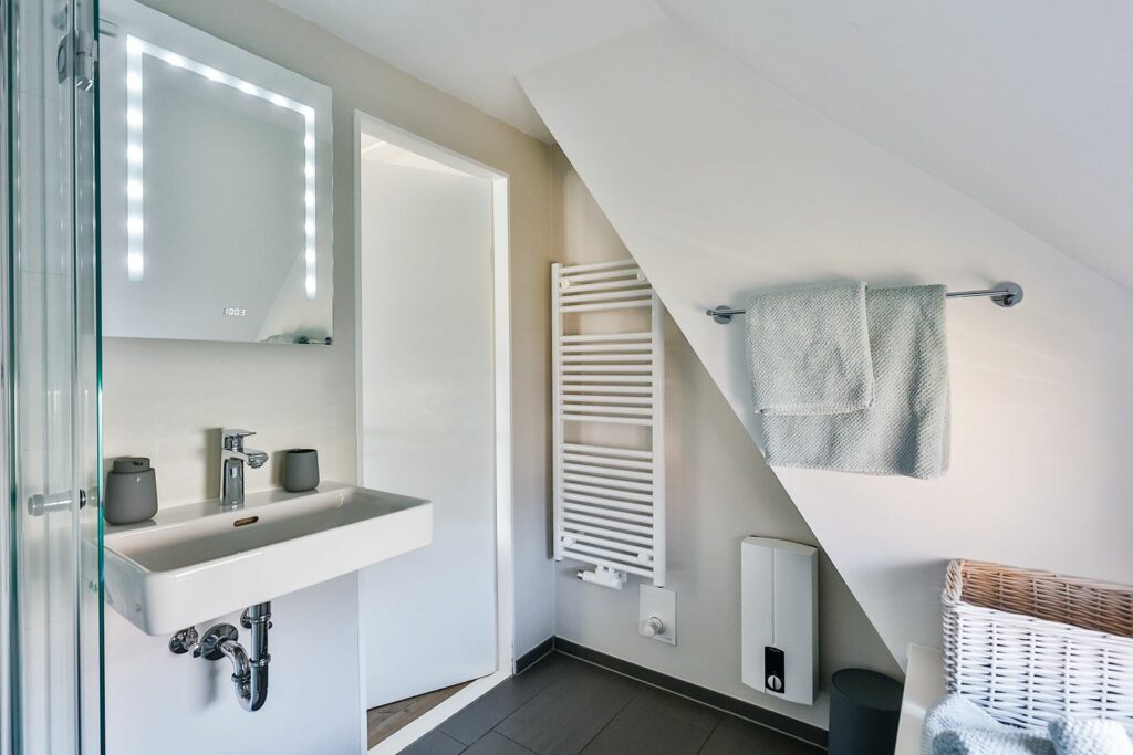 Unbedingt erwähnenswert ist auch das ganz in Beige gehaltene Bad, das mit einer Regendusche und genügend Ablagefläche punktet.