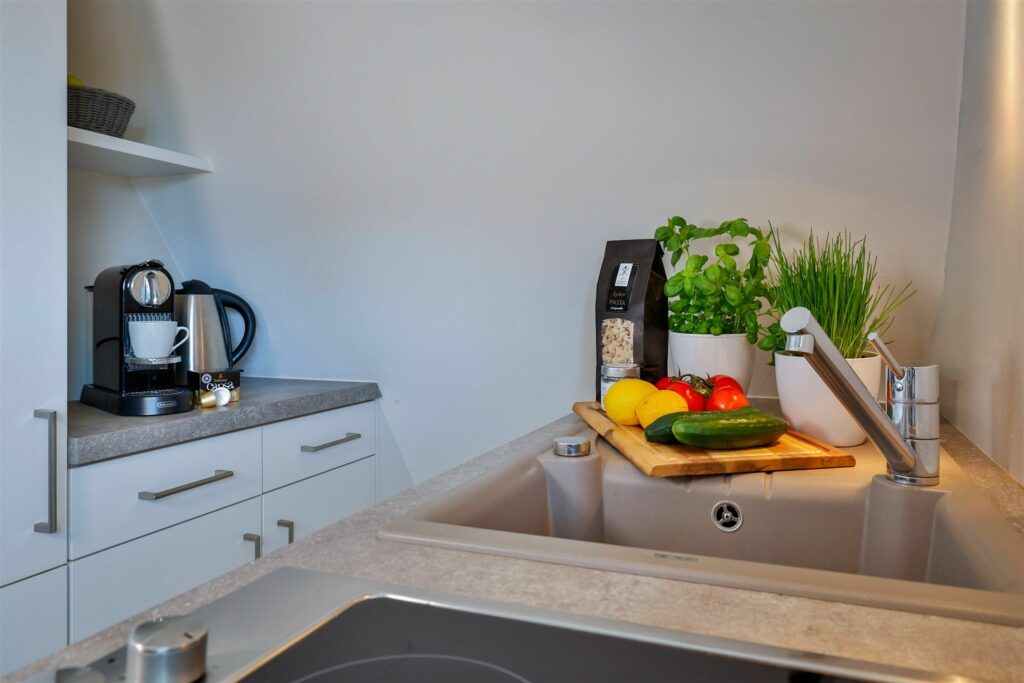 Mit viel Weiß, viel Licht und cleveren Stauraumlösungen wurde dem Appartement zu ungeahnter Größe und viel Gemütlichkeit verholfen. Im Mittelpunkt steht das bequeme Bett (160x200cm), das zum Ausschlaf...Weiterlesenen einlädt. Vom Esstisch geht der Blick ins Grüne und wer gerne "mittendrin" sitzt, kann auch auf der kleinen Balkon-Terrasse oder direkt unten im Garten sitzen. Die Küche passt haargenau in die Dachnische und bietet alles, was das Essen zum Genuss werden lässt.